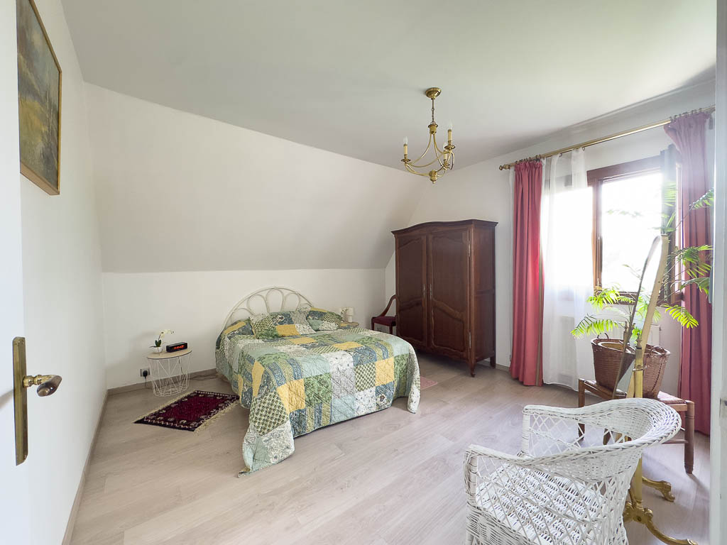 À l’étage, l’espace nuit se compose de trois chambres aux volumes confortables, de rangements, d’une salle de bains et de WC indépendants.