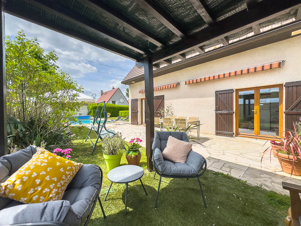 À l’extérieur, la maison bénéficie d’une terrasse et d’une piscine exposée plein sud, sans vis-à-vis, offrant un cadre idéal pour profiter des beaux jours.
